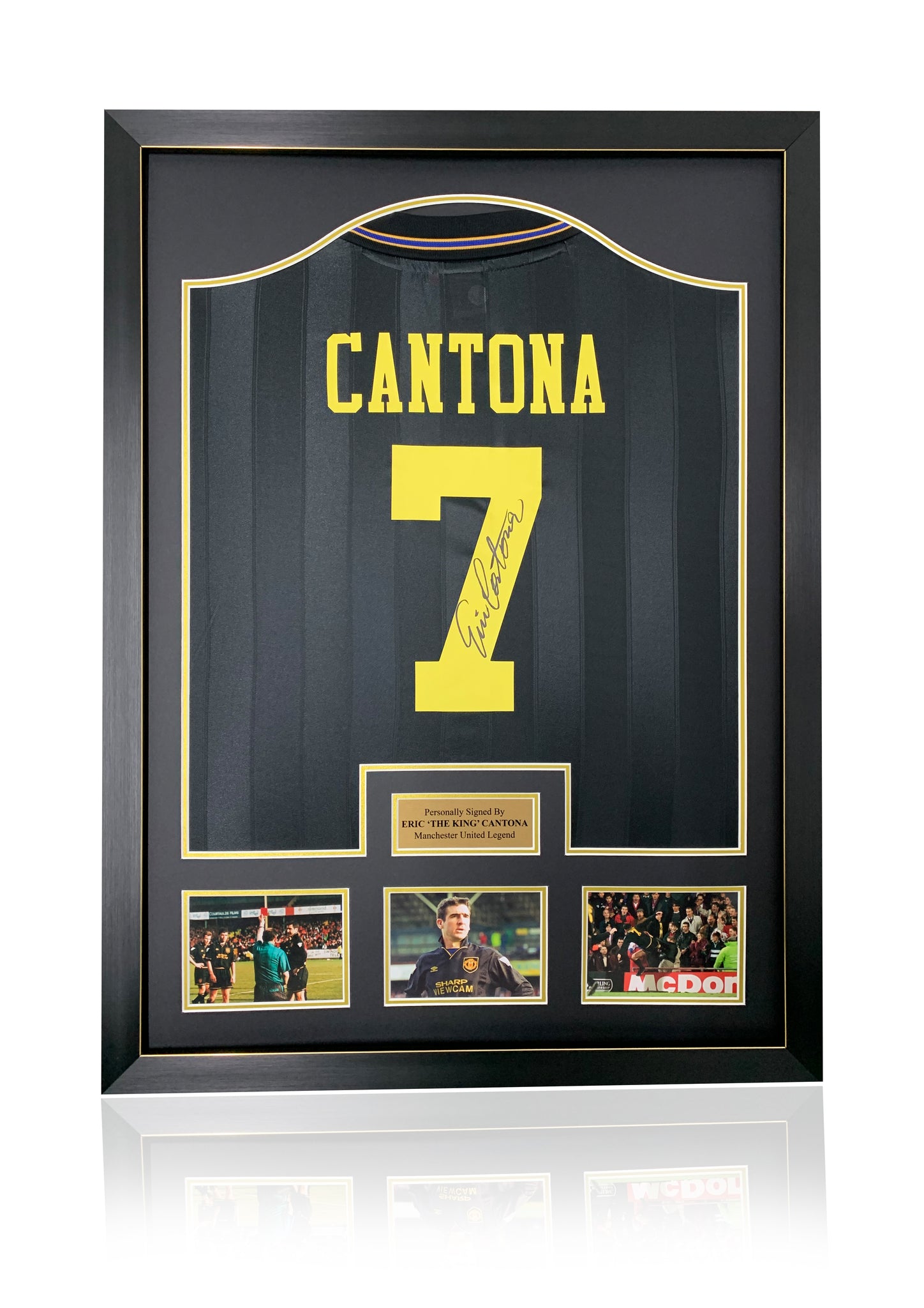 Genuine hand signed Eric 'The King' Cantona number 7 Manchester United framed shirt as worn in the infamous kung fu kick moment signed football shirt sports memorabilia